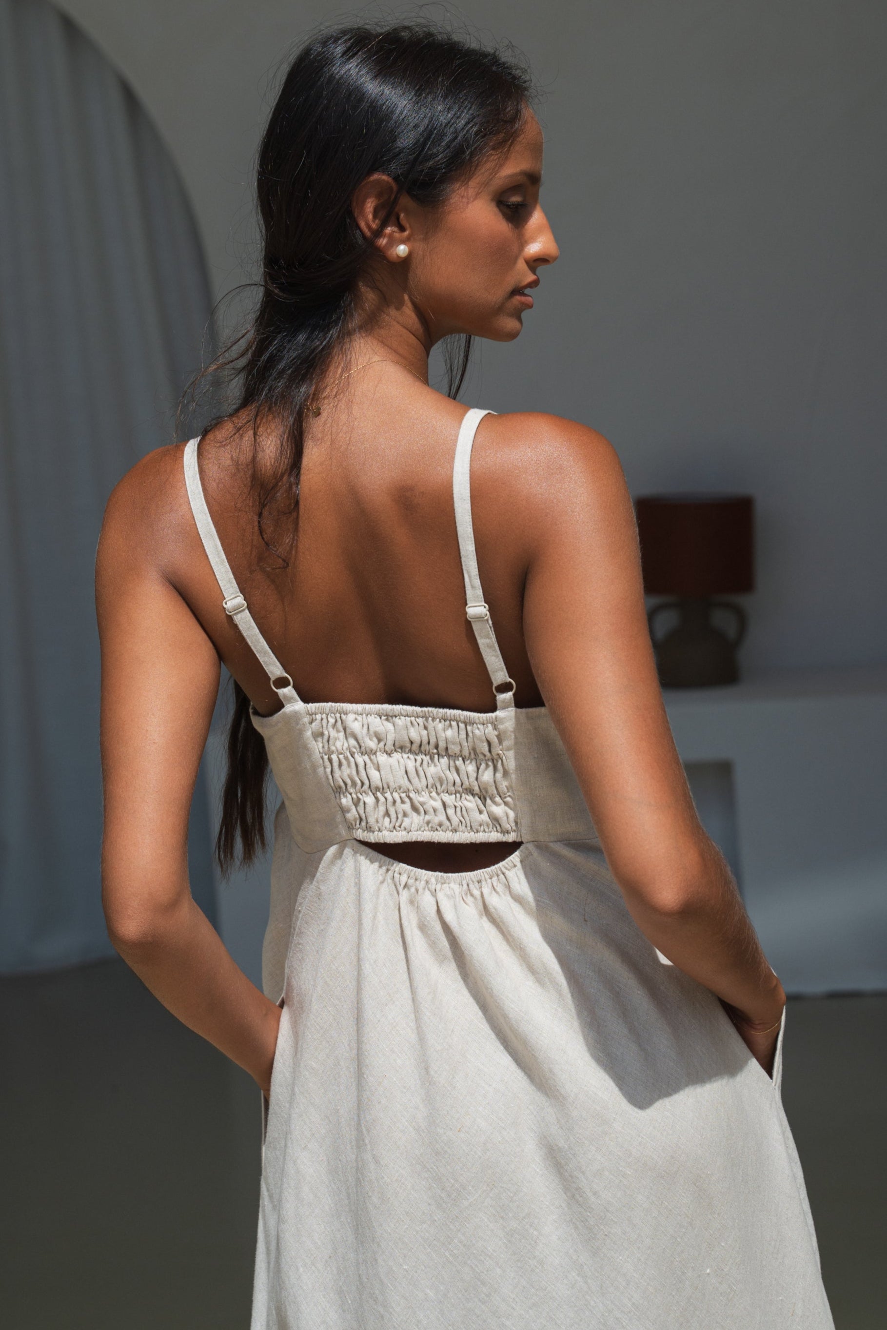 Our KIKO Linen Dress is an effortlessly chic bias-cut midi dress designed to flatter every shape. Made from 100% EUROPEAN FLAX® certified linen, she features an empire neckline with a soft draped overlay for a touch of understated elegance. Adjustable shoulder straps and an elasticated back neckline with a subtle cut-out ensure a perfect, bra-friendly fit, while seam pockets and French seams add thoughtful details. True to size, petite-friendly, and ready to become your new wardrobe staple.